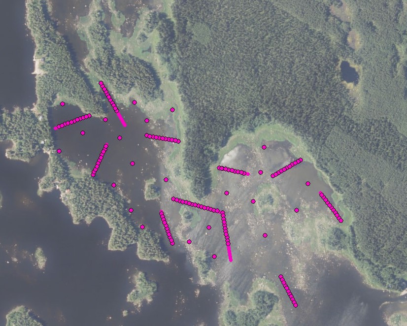LajiGIS-tietokantaan vietynä maastossa tehdyt näytepisteet- ja linjat näyttävät osuvan pohjakartan kanssa yksiin. Kuva: Metsähallitus