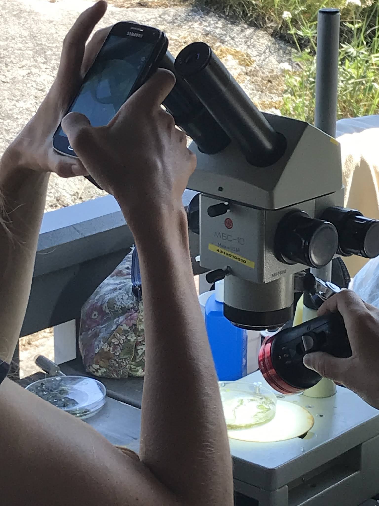 | Sähköttömässä mökissä mikroskoopin valo hoituu sukellustaskulampun avulla. Kuva: Essi Keskinen |